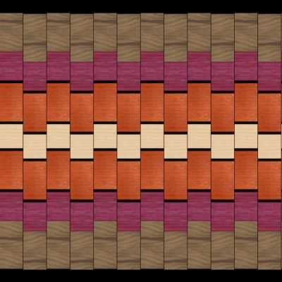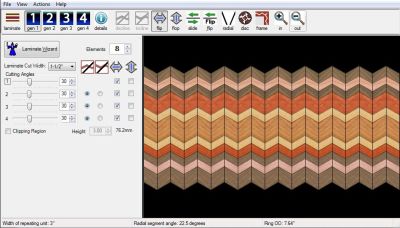 Once you have finished creating your laminated board, press Continueand the board will be placed in your main work area for further processing. To make a multi-generation design in the shop, you would take that board and cut it with your saw at a predetermined miter angle into strips, reassembling it by flipping alternate strips left-to-right or top-to-bottom to make a 1st generation board. Lamination PRO duplicates this process virtually so that a single keystroke immediately shows you what your 1st generation board (often called a zig-zag or chevron pattern) will look like. If you take a first generation board andrepeat the same process, you'll get a second generation pattern. And then a 3rd generation pattern. And if that's not enough, you can now have a 4th generation pattern. While understanding the multi-generation process isn't difficult, creating a lamination design that will have the desired dimensions and appearance is far from simple. That's where Lamination PRO's power and flexibility shines.