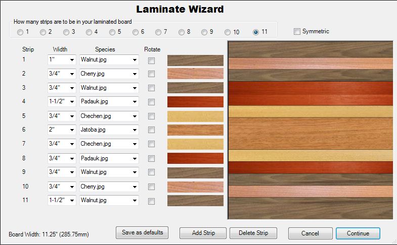 For each number of strips, you can create your own default configuration. Adding additional species is as simple as copying image files into a folder. Version 3 even has end grain and solid counter top images.